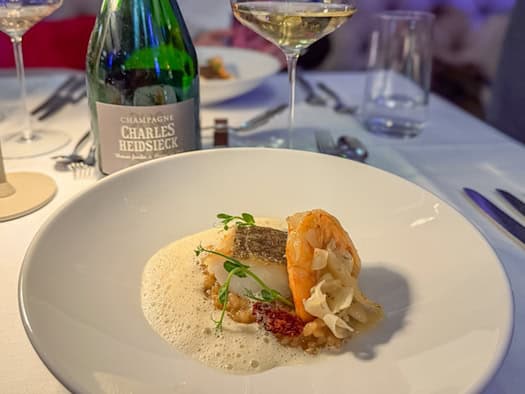 V drážďanské restauraci Stresa doprovázelo šestichodové menu několik šampaňských Charles Heidsieck: uzená kachní prsa s miso kuličkami, pikantní hovězí consommé a další výrazné chody na slavnostním večeru (menu včetně šampaňského: 195 eur). | více