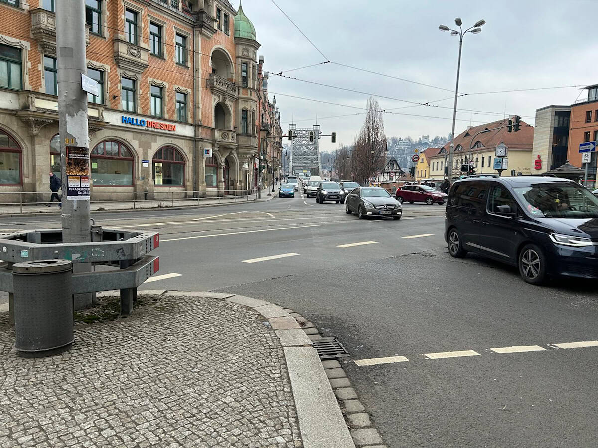 Vom 10. bis 23. Februar ist am Schillerplatz im Bereich der Tolkewitzer Straße nur noch das Rechtsabbiegen auf das Blaue Wunder möglich. Aus Richtung Blaues Wunder darf ebenfalls nur rechts in die Naumannstraße abgebogen werden. Alle anderen Fahrtrichtungen sind gesperrt. Für Fahrten zwischen Käthe-Kollwitz-Ufer und Tolkewitz sowie umgekehrt sind ausgeschilderte Umleitungen eingerichtet, die südwestlich am Schillerplatz vorbeiführen.