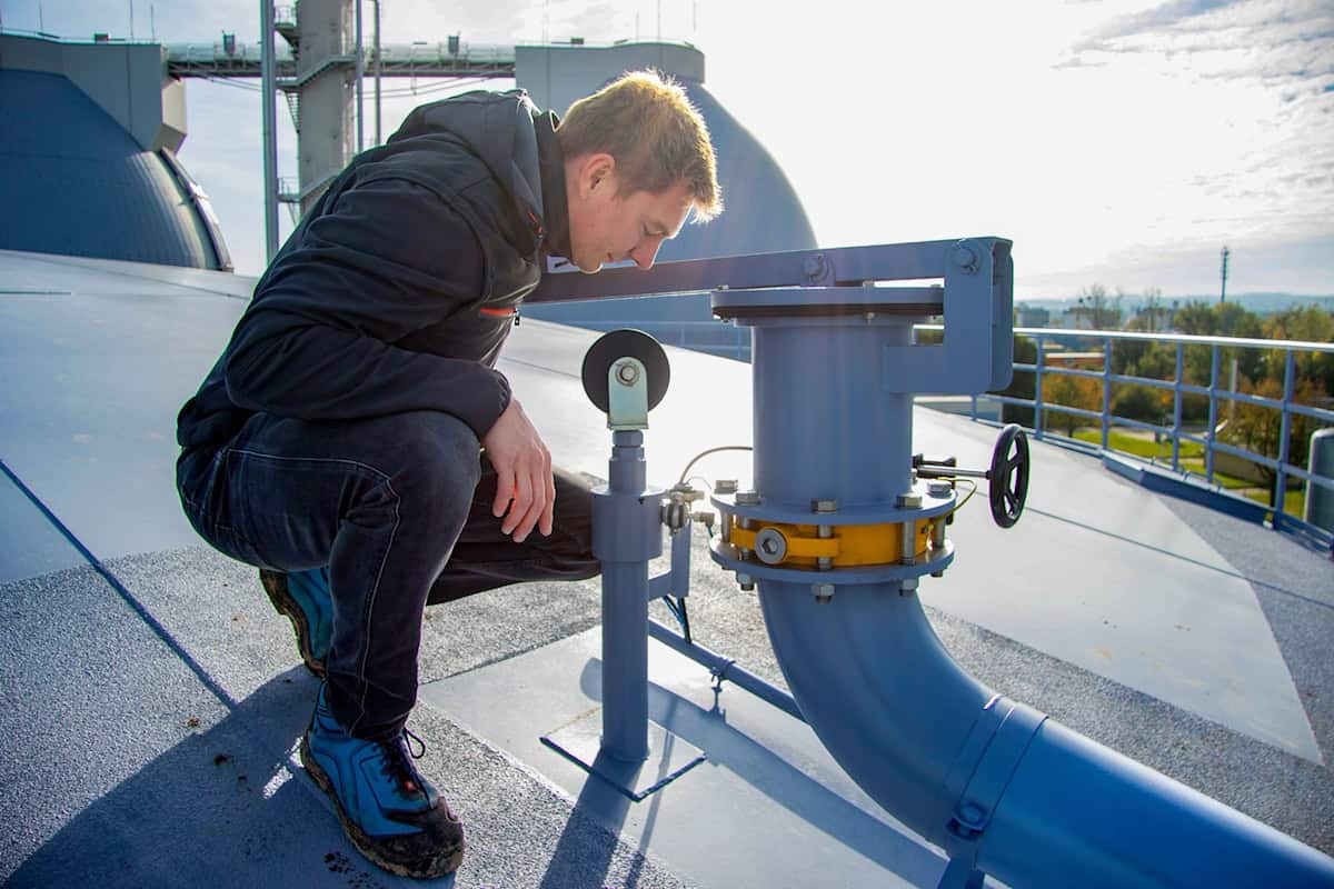 Elektroingenieur Damian Fitula prüft gerade diesen Sensor auf dem Dach des neuen Behälters, der 5.000 Kubikmeter Klärgas fasst. Aus dem wird in Blockheizkraftwerken Strom und Wärme erzeugt.