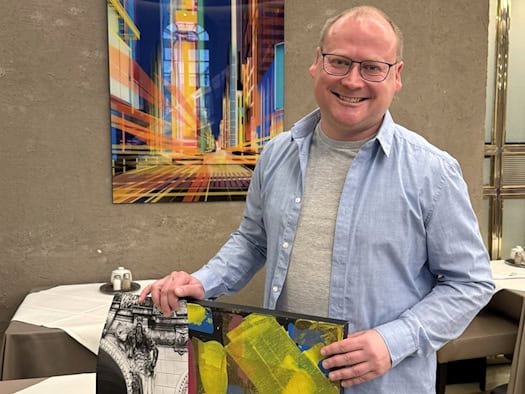Steffen Schuster präsentiert 'Zwischenwelten' im Restaurant Kastenmeiers in Dresden: analoge Spachtel- und Foto-Transfer-Technik trifft digitale Architekturdrucke. Ausstellung bis 24. April, Besichtigung täglich ca. 15–17 Uhr. | mehr