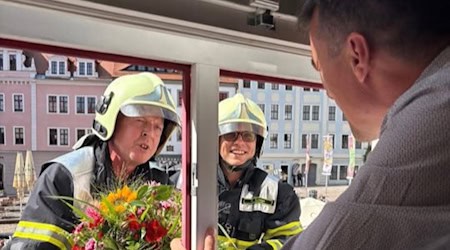 Die Freiwillige Feuerwehr Meißen überbrachte Glückwünsche an Markus Renner mit Blumen. Eine symbolische Geste für die enge Verbindung zur Feuerwehr. | mehr