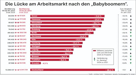 Die Lücke, die die Babyboomer am Arbeitsmarkt in den 15 größten Städten in Deutschland hinterlassen werden, wird immer größer, so das Ergebnis einer Analyse durch die Jobbörse JobNinja. Gegen den Trend stemmt sich nur die sächsische Metropole Dresden, auch Leipzig schlägt sich (noch) einigermaßen gut. | mehr