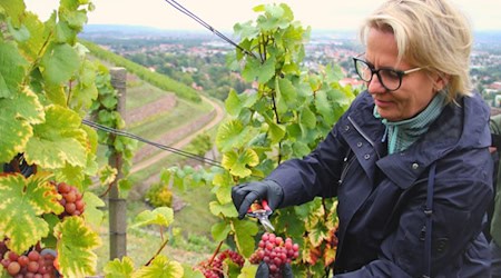 Barbara Klepsch und Winzer ernten Trauben für die Traminer Spätlese. Kulinarik und Genuss stärken den Weintourismus in Sachsen, wird betont. | mehr