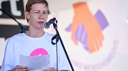 Die Schauspielerin Sandra Hüller nimmt als Rednerin an einer Kundgebung gegen Rechtsextremismus in Leipzig teil. | mehr
