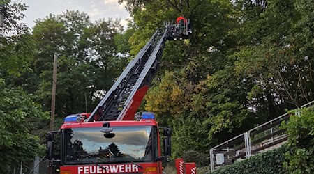 Die Feuerwehr Zehren setzte eine Drehleiter ein, um die Gefahr zu beseitigen. | mehr